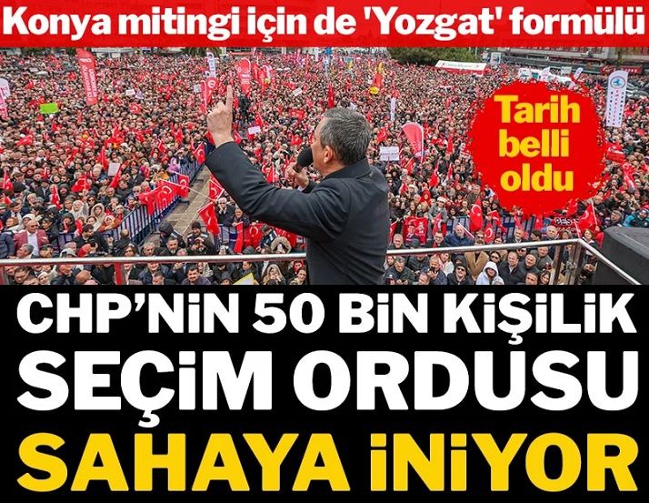 Yozgat mitingindeki yoğun katılımın ardından mitingleri AKP'nin yüksek oy oranına sahip olduğu illerde devam ettirme kararı alan CHP, bu hafta sonu Ekrem İmamoğlu’na özgürlük talebini, son genel seçimde Cumhurbaşkanı Recep Tayyip Erdoğan’ın yüzde 73 oy aldığı Konya’dan dile getirecek. Saat 14.00’te Kılıçarslan Kent Meydanı’nda düzenlenecek olan mitingin hazırlıkları için milletvekilleri ve PM üyelerinden oluşan CHP heyeti, hafta başından itibaren Konya’daki hazırlıklarını sürdürüyor.