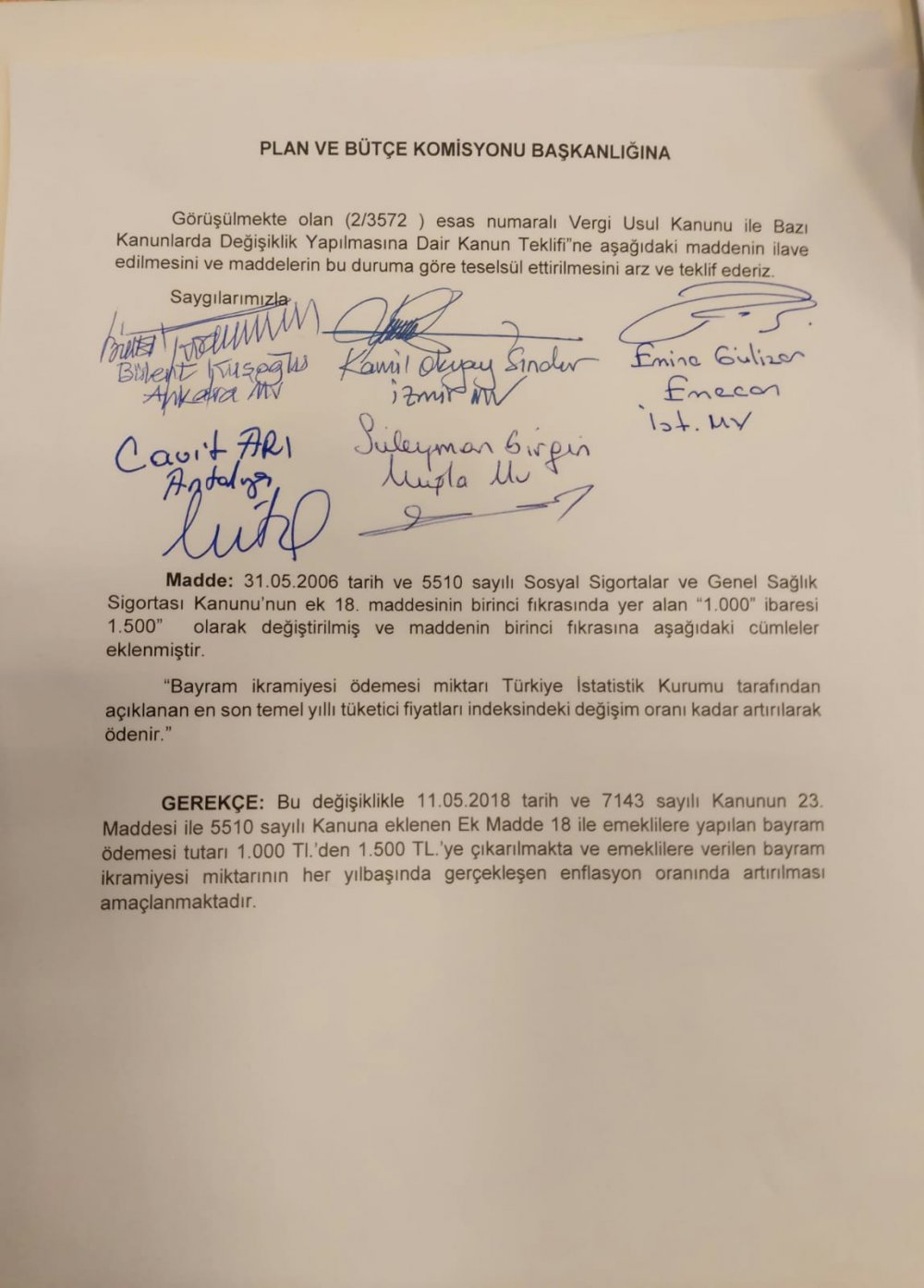 CHP Plan ve Bütçe Komisyonu üyesi vekiller, dün “Vergi Usul Kanunu ile Bazı Kanunlarda Değişiklik Yapılması Hakkında Kanun”un görüşmeleri esnasında emeklilere yapılan bayram ödemesi tutarının bin liradan, bin 500 liraya çıkarılması ve bayram ikramiyesi miktarının her yıl gerçekleşen enflasyon oranında artırılması için önerge verdi.