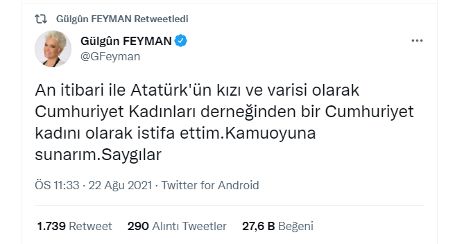 Cumhuriyet Kadınları Derneği Genel Başkanı Oygür'ün açıklamalarının ardından derneğin üyesi olan haber spikeri Gülgin Sayman, "An itibari ile Atatürk'ün kızı ve varisi olarak Cumhuriyet Kadınları derneğinden bir Cumhuriyet kadını olarak istifa ettim.Kamuoyuna sunarım.Saygılar." açıklamayla dernekten istifa ettiğini duyurdu.
