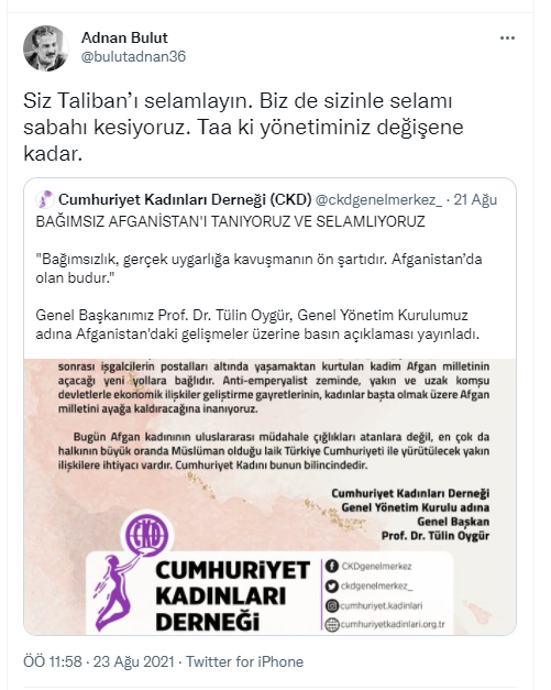 KRT TV Genel Müdürü, gazeteci Adnan Bulut, Cumhuriyet Kadınları Derneği'nin Twitter hesabından yağılan açıklamayı paylaştı. Bulut, "Siz Taliban’ı selamlayın. Biz de sizinle selamı sabahı kesiyoruz. Taa ki yönetiminiz değişene kadar." dedi.