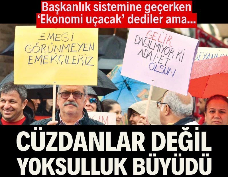 İKTİDAR ekonomi için sürekli pembe tablolar çiziyor fakat milyonlarca vatandaş yoksulluk girdabından çıkamıyor. Başkanlık sistemine geçerken söylenen güzel sözler de yalan oldu. Ekonomik büyüklük 7 yılda 3.1 trilyon liradan 46.7 trilyon liraya çıkarken 15 kat artış yaşandı fakat açlık sınırı da yoksulluk sınırı da aynı dönemde 16’ya katlandı. Emekli aylıklarında 10 kat, asgari ücrette 13.7 katlık artış yaşanırken emeklinin ve asgari ücretlinin geçim derdi, yani sırtındaki kambur maaşlardan fazla büyüdü.