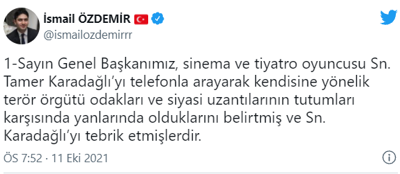 Sosyal medya hesabından paylaşım yapan Özdemir, ''Sayın Genel Başkanımız, sinema ve tiyatro oyuncusu Sn. Tamer Karadağlı’yı telefonla arayarak kendisine yönelik terör örgütü odakları ve siyasi uzantılarının tutumları karşısında yanlarında olduklarını belirtmiş ve Sn. Karadağlı’yı tebrik etmişlerdir'' ifadelerini kullandı.