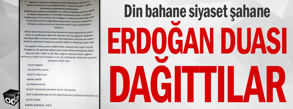 Bayram günü okunması için komşularına bu duayı dağıttığı ileri sürülen kadının yazdıkları arasında, “Ey kalpleri çeviren Allah’ım sen atılacak olan oyları Tayyip Erdoğan ve Ak Parti’nin lehine çevir” ifadeleri yazıyor.
