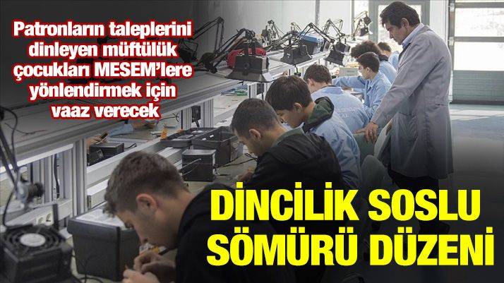 Eğitimde gericilik ve sermayenin ağırlığı 4+4+4 sistemine geçildiğinden beri sürekli arttı. Ancak son yıllarda hayata geçen mesleki eğitim merkezleriyle (MESEM) çocuk işçiliğine yasal kılıf hazırlayan Milli Eğitim Bakanlığı’nın (MEB) bu projesi patronların yeni taleplerine yol açıyor. Önceki gün İstanbul Ticaret Odası’nın MESEM’lere ağırlık verme talebinin ardından Antalyalı patronlar İl Müftüsü Nazif Fethi Yalçınkaya’dan çıraklık konusunda destek istedi. Yalçınkaya, camileri çocuk emeği sömürüsüne çağrı yeri olarak kullanacak.