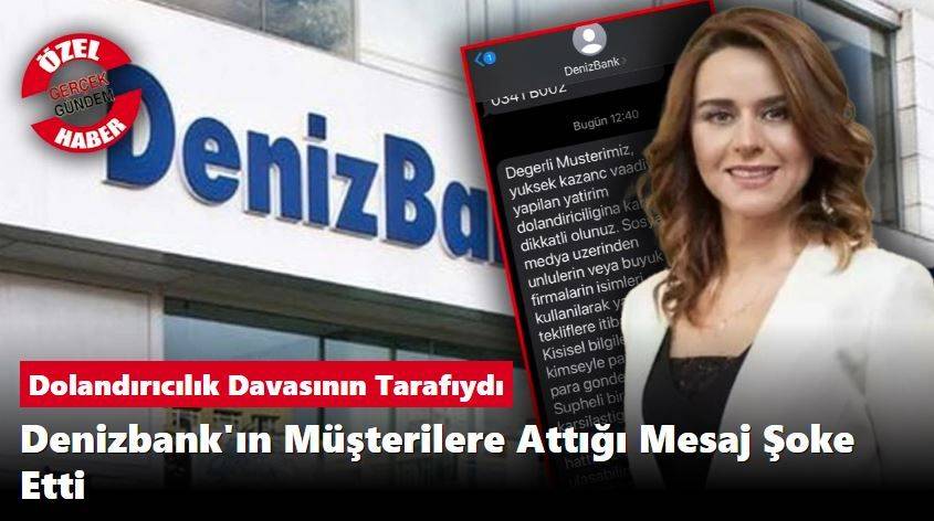 Dolandırıcılık davasının ana unsuru haline gelen Denizbank, müşterilerine "Bu kadarı da olmaz" dedirtecek bir mesaj attı. Mesajda banka, müşterilerini yüksek kazanç vaadiyle yapılan yatırım dolandırıcılığına karşı uyardı. Bununla da yetinmeyip sanki Seçil Erzan davasından bahsedermiş gibi "Ünlülerin ve büyük firmaların isimleri kullanılarak yapılan tekliflere itibar etmeyin" mesajı gönderdi.
