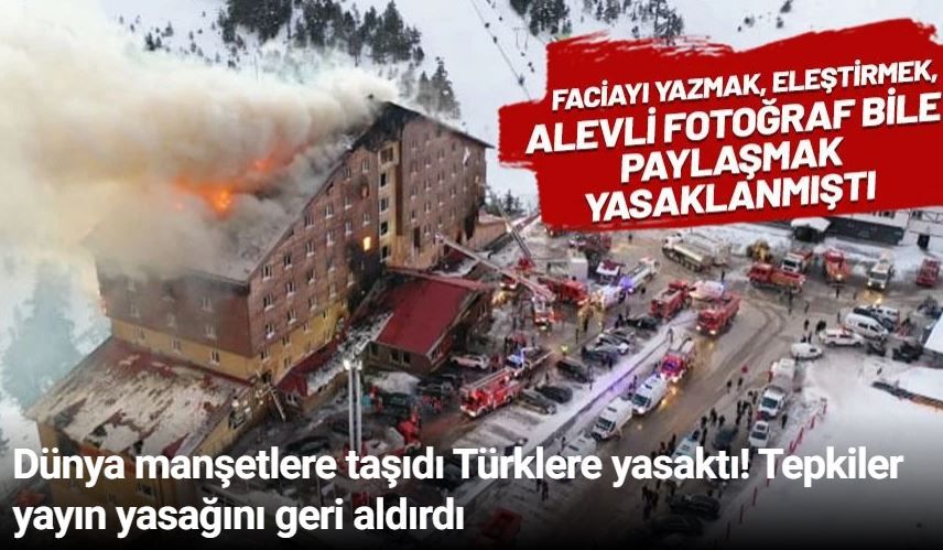Bolu Kartalkaya Kayak Merkezi'ndeki Grand Kartal Otel'de çıkan yangında 76 kişi yaşamını yitirdi. Olayın ardından getirilen yayın yasağı tepkilere neden olmuştu.