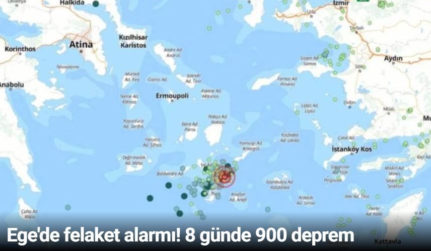 “Ege Denizi içinde, Santorini Adası ve civarında meydana gelen ve 28 Ocak 2025 tarihinden itibaren yoğunlaşmaya başlayan depremlerin sayısı 5 Şubat 2025 itibariyle 900’ün üzerine çıkmıştır. Depremlerin dağılımı görülmektedir. Deprem fırtınası şeklinde gelişen bu aktivite sonucunda kaydedilen en büyük deprem 5.1 Mw büyüklüğündedir. Depremler Santorini Adası’nın yaklaşık 25 km kuzeydoğusunda artış göstermekte olup derinlikleri 5 km ile 25 km arasında değişmektedir. Ülkemiz kıyılarına en yakın deprem 140 km mesafededir.''