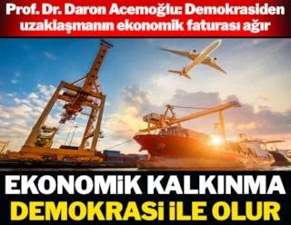 Acemoğlu, “Bir ülke demokrasiye geçtiğinde, diğer otoriter rejimlere kıyasla daha hızlı büyüyor. Bu yaklaşık 7–8 yıl sürüyor, ardından 13 yıl kadar süren güçlü bir büyüme patlaması yaşanıyor. Bu sürecin sonunda ise o ülke yaklaşık yüzde 15 ile yüzde 20 daha zengin hale geliyor” dedi. Sunumunda, demokrasiye sırt çeviren ülkelerde kişi başına düşen gayrisafiyurtiçi hasılanın (GSYH) yaklaşık yüzde 20 oranında azaldığını vurgulayan Acemoğlu, Türkiye’nin demokrasi skorundaki düşüşe de dikkat çekerek, “Türkiye bu konu için ilginç bir vaka çünkü VDem’e göre demokrasi skorunda en büyük düşüşlerden birini yaşadı. Türkiye’de hâlâ seçimler ve parlamenter yapı bulunsa da, medya bağımsızlığının ve muhalefet imkanlarının zayıflamasıyla demokratik kalite ciddi ölçüde zarar gördü” diye konuştu.
