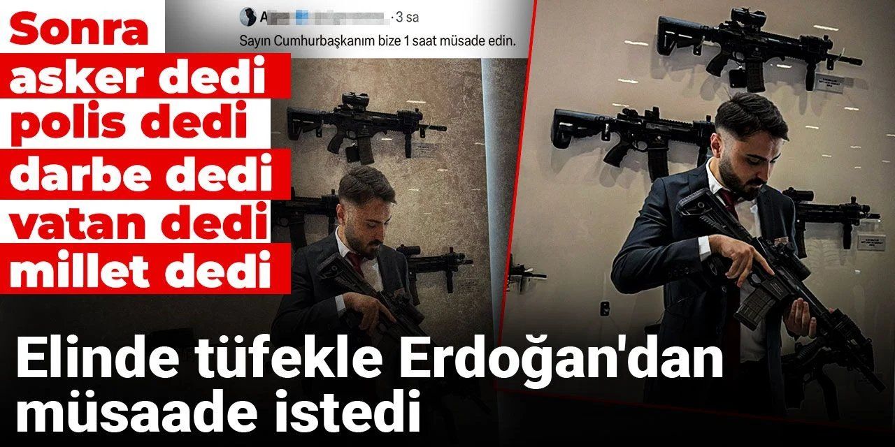Cumhurbaşkanı Erdoğan'dan 1 saat müsaade isteyerek elinde Milli Piyade Tüfeği (MPT) ile verdiği pozu paylaşan A. isimli şahsın ne için müsaade istediği anlaşılamadı.
