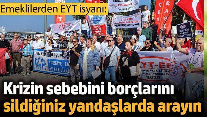 “İktidar sahipleri tarafından EYT’li emeklilerin ekonomiye yük getirdiği ve oluşan krizlerin baş şüphelisi olarak gösterilmesini ve EYT’lileri toplumun önüne atarak, yönetemedikleri maliye ve ekonomi politikalarına kılıf olarak kurban verip günah keçisi ilan etmiştir. Son olarak da oğul Sayın Erdoğan, ‘EYT bu ülke için bir felakettir’ diyerek bu güzide vatanın öz evlatlarını, yıllarca ödediği primler ve verdiği emeklerle kutsal alın teri sahibi EYT’li emeklileri derinden üzmüş ve öfkelendirmiştir. Bu sözlere karşılık bizler de diyoruz ki; asıl felaket, konusu hak olan bir davada 24 yıl sonra haklarına kısmen kavuşan Türkiye Cumhuriyeti’nin öz evlatları, aziz milletin fertleri, varlığını ve emeklerini ülkesine adayan, alın teri sahibi vatanseverler için söylenen çirkin sözlerdir.