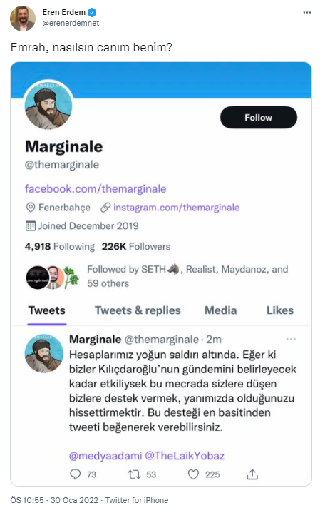 Erdem'in paylaşımlarına göre, Marginale isimli hesap TÜGVA Mütevvelli Heyeti Üyesi Emrah Atilla'ya ait.