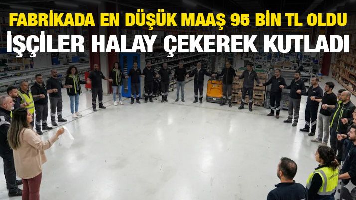Giydirilmiş net ücretin aylık 95 bin TL'ye yükseltilmesinin ardından aldıkları zam ve sosyal ödemeler için kutlama yapan işçiler, hep birlikte halay çekti.