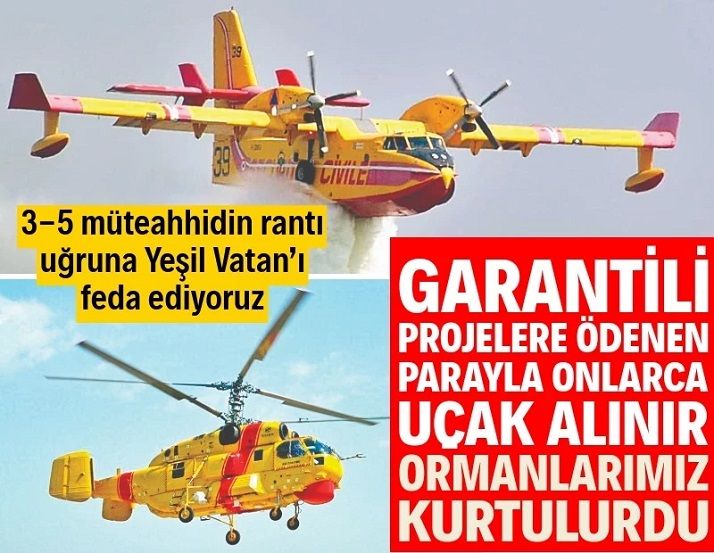 Garantili projelere akıtılan milyarlarca lira ile OGM’nin geçen yıllarda kiraladığı CL415 (Fiyatı 35 milyon dolar) amfibi yangın söndürme uçaklarından 215 tane, Kamov Ka32 (Fiyatı 10 milyon dolar) ağır sınıf helikopterlerden 600 tane satın alınabilirdi.