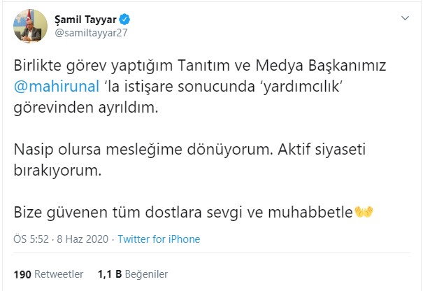 AKP'nin eski Gaziantep Milletvekili Şamil Tayyar, Twitter'dan yaptığı açıklamada 1 ay önce atandığı AKP'nin Medya ve Tanıtım Başkan Yardımcılığı'ndan istifa ettiğini açıkladı.