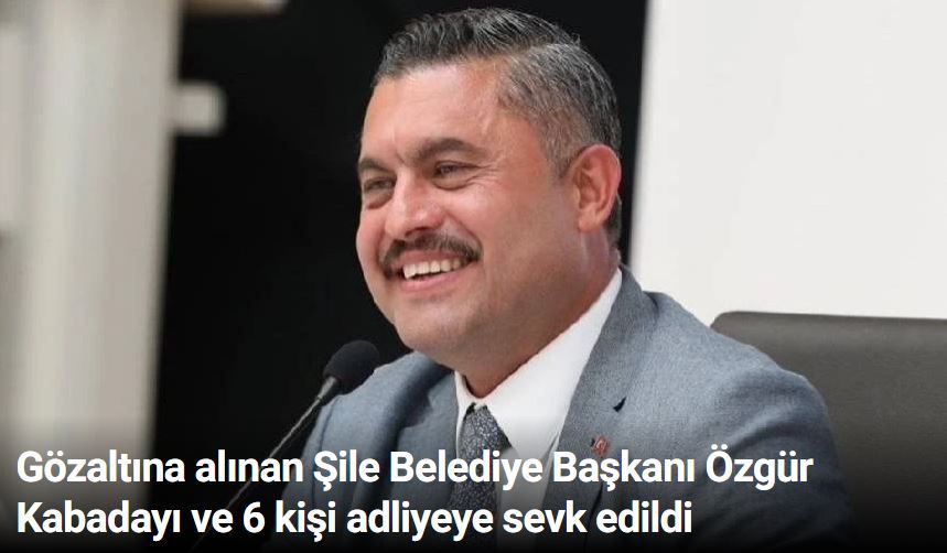 Şile Belediyesi’ne yönelik başlatılan yolsuzluk ve rüşvet soruşturmasında gözaltına alınan Şile Belediye Başkanı Özgür Kabadayı ile birlikte toplam 6 şüpheli, emniyetteki işlemlerinin tamamlanmasının ardından adliyeye sevk edildi. Soruşturma kapsamında şüphelilere “suç işlemek amacıyla örgüt kurma”, “rüşvet”, “irtikap” ve “ihaleye fesat karıştırma” gibi ağır suçlamalar yöneltiliyor.