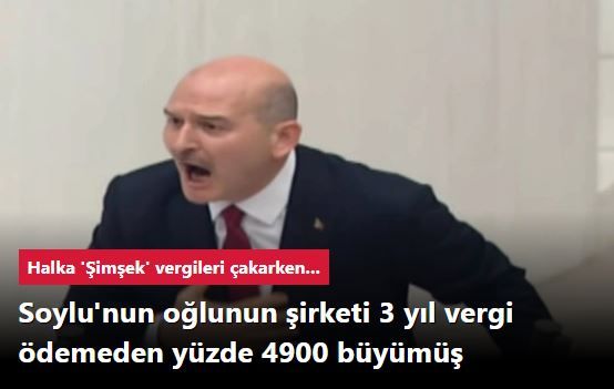 Flash Haber’den Bora Erdin'in haberine göre, Soylu’nun oğlunun şirketinin 3 yılda hiç vergi ödemeden yüzde 4900 büyüdüğü ortaya çıktı.