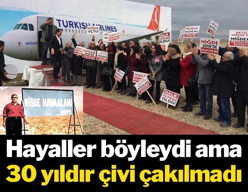 Niğde’ye havaalanı kararı alan dönemin hükümeti, 1995 yılında temelini attı. Ancak temeli atıldıktan sonra Nevşehir ve Kayseri Havaalanları hizmete girince bu projeden vazgeçildi. Aradan 30 yıl geçmesine rağmen Niğdeliler hala umutla bekliyor.