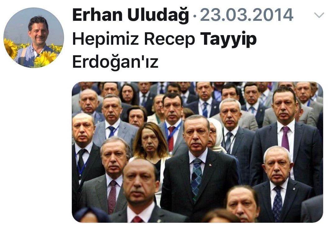Cumhurbaşkanı Recep Tayyip Erdoğan’ın yanı sıra AKP’nin önde gelen pek çok ismiyle de fotoğraf çektiren Erhan Uludağ, 2014 yılında yaptığı bir paylaşımda “Hepimiz Recep Tayyip Erdoğan’ız” demişti.