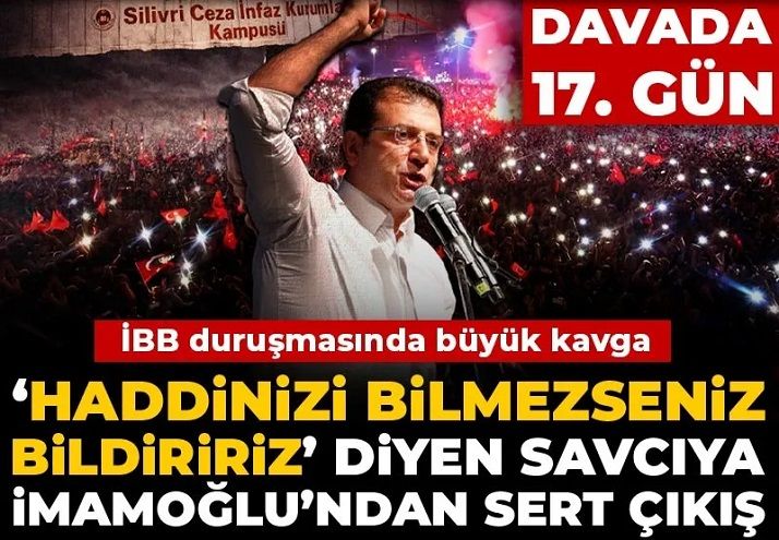 89'u tutuklu 407 sanıklı İBB davasında bugün 5. hafta 17. gün celsesi Ekrem İmamoğlu'nun dünkü "Tek suç örgütü iddia makamıdır" sözleri ve soruşturmanın gerilimiyle başladı. Duruşmanın savcı İmamoğlu'na "Haddinizi bilmezseniz bildiririz" diyerek salonda tansiyonu yükseltti. Avukatların sert itirazı ve İmamoğlu'nun savcıya 'Sen kime bakıyorsun' sözleriyle süren tansiyon güçlükle düşürüldü.