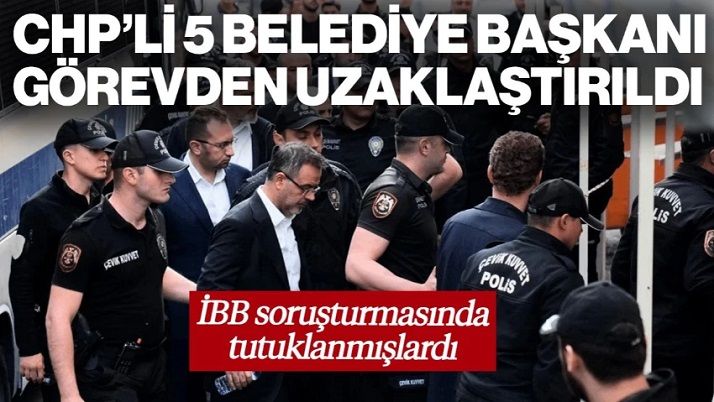 Belediyelere yönelik yolsuzluk iddiasıyla başlatılan soruşturma kapsamında, Avcılar Belediye Başkanı Utku Caner Çaykara, Büyükçekmece Belediye Başkanı Hasan Akgün, Gaziosmanpaşa Belediye Başkanı Hakan Bahçetepe, Ceyhan Belediye Başkanı Kadir Aydar ve Seyhan Belediye Başkanı Oya Tekin’in görevden uzaklaştırıldığı bildirildi.