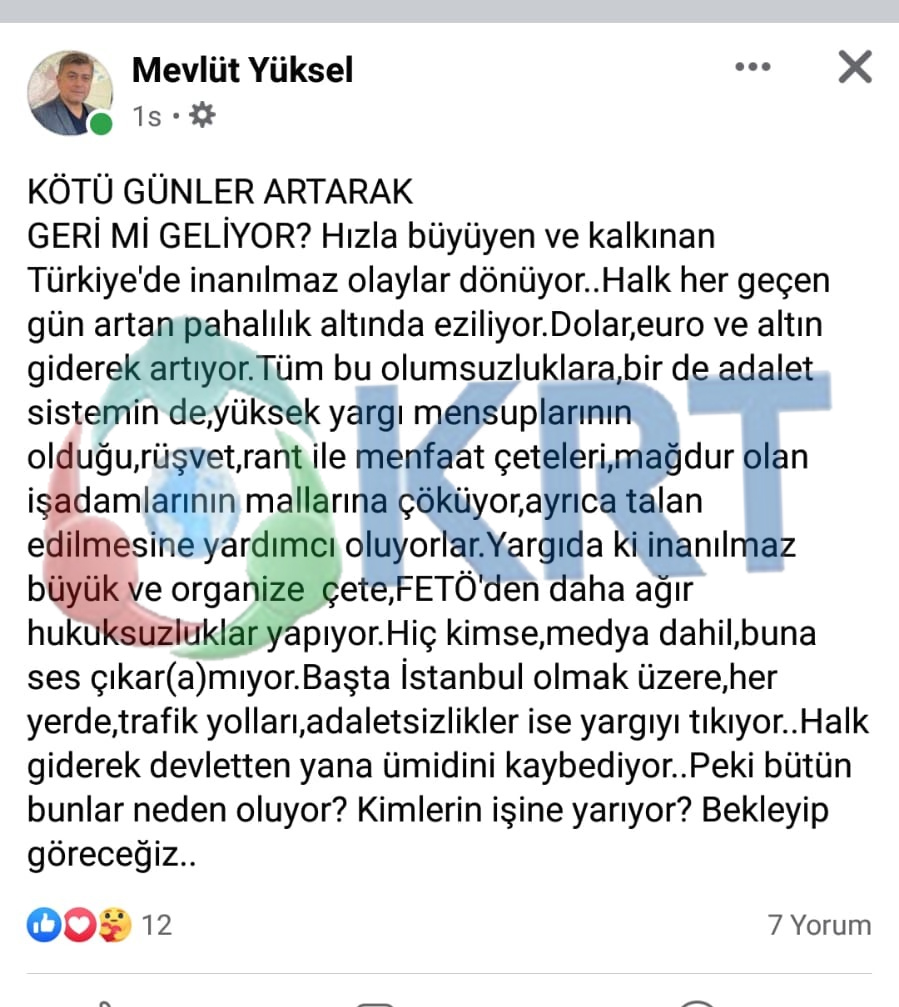 Yüksel, Facebook'tan yaptığı paylaşımda AKP iktidarını topa tuttu. Yüksel daha sonra da bu paylaşımını kaldırdı.