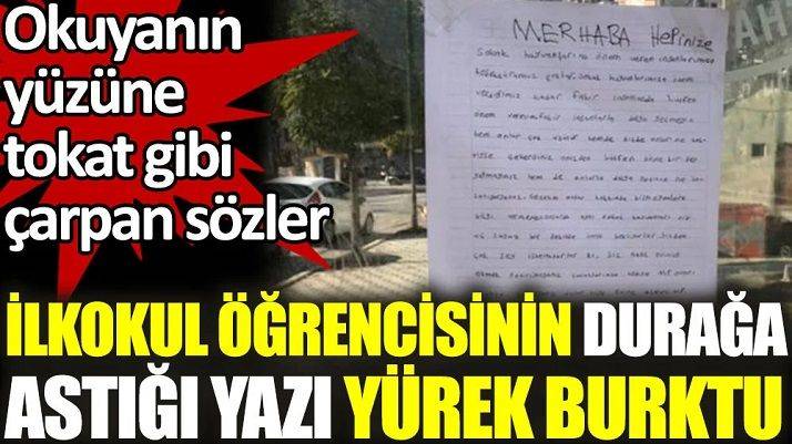 Gümüşhane'nin Hasanbey Mahallesi'nde bulunan Dumlupınar İlkokulu'nun karşısında yer alan otobüs durağına ilkokul öğrencisi tarafından yazıldığı ve asıldığı değerlendirilen yazı okuyanların duygu dolu anlar yaşamasına neden oldu.