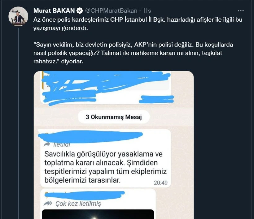 Bir polisin kendisine gönderdiği WhatsApp yazışmalarını Twitter’dan yayınlayan CHP İzmir Milletvekili Murat Bakan, İstanbul İl Emniyet Müdürü Zafer Aktaş’a seslendi.