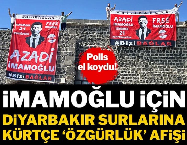 CHP'nin Bağlar ilçe örgütü CHP'nin Cumhurbaşkanı adayı ve tutuklu İBB Başkanı Ekrem İmamoğlu'nun fotoğrafının yer aldığı ve üzerinde Kürtçe ‘Özgürlük’ yazan pankartı Diyarbakır Surlarına astı.