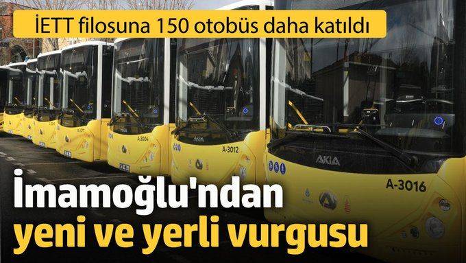 Sosyal medya üzerinde bir duyuru yapan Ekrem İmamoğlu İETT filosuna 150 yeni otobüsün daha katıldığını açıklayarak İstanbullulara 'Hayırlı uğurlu olsun' dedi. İmamoğlu paylaşımında otobüslerin yeni ve yerli olduğunu vurguladı. İmamoğlu ayrıca paylaşımına İETT filosunun görüntülerini de ekledi.