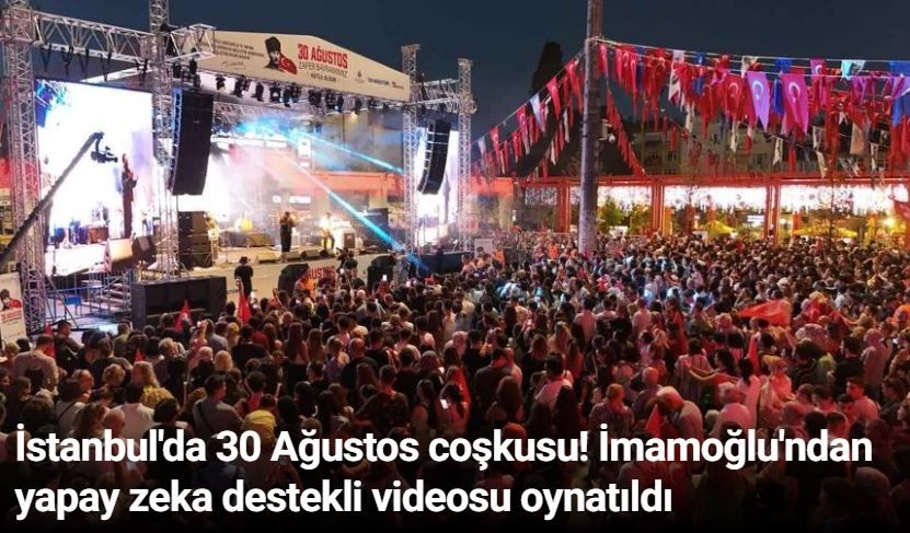 İstanbul Büyükşehir Belediyesi (İBB), 30 Ağustos Zafer Bayramı’nın 103’ncü yıldönümünü, Bakırköy Cumhuriyet Meydanı’nda düzenlenen etkinliklerle kutladı. Etkinlikte, İBB Bandosu gösterisi, DJ performansı, Ozbi konseri ve Ceylan Ertem konseri yer aldı. Silivri Cezaevi'nde tutuklu bulunan İBB Başkanı ve CHP’nin cumhurbaşkanı adayı Ekrem İmamoğlu’nun yapay zeka ile oluşturulmuş video görseli ekrana verildi.