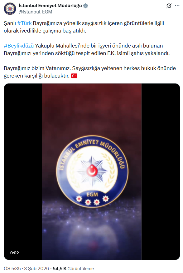 İstanbul Emniyet Müdürlüğü, olayla ilgili yaptığı açıklamada, “Şanlı Türk Bayrağımıza yönelik saygısızlık içeren görüntülerle ilgili olarak ivedilikle çalışma başlatıldı.