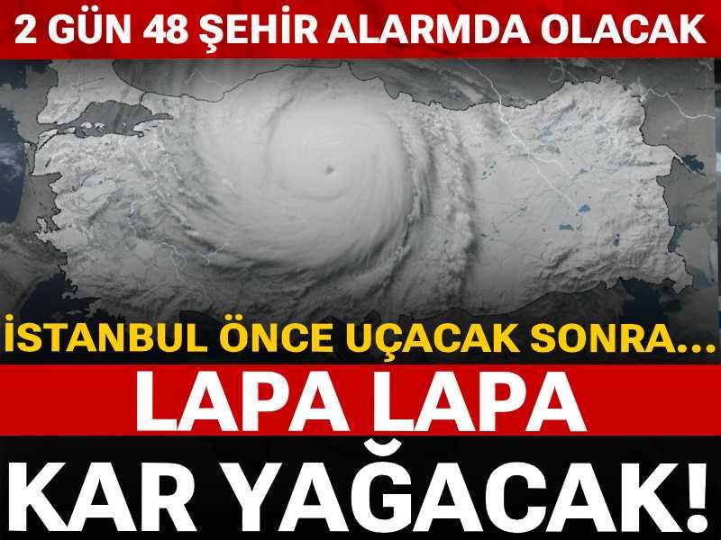 Mola bitti. Valilikler, Meteoroloji ve İBB AKOM tarafından yapılan uyarıları yapılan karlı hava Türkiye'ye giriş yaptı. Yurdun batısı önce fırtına ile karşılaşacak, sonra Doğu'da başlayan kar tüm haritaya yayılacak. Hafasonu için sarı kodla alarm veren Meteoroloji, bu kez 48 ilde yaşanacaklara karşı uyardı.