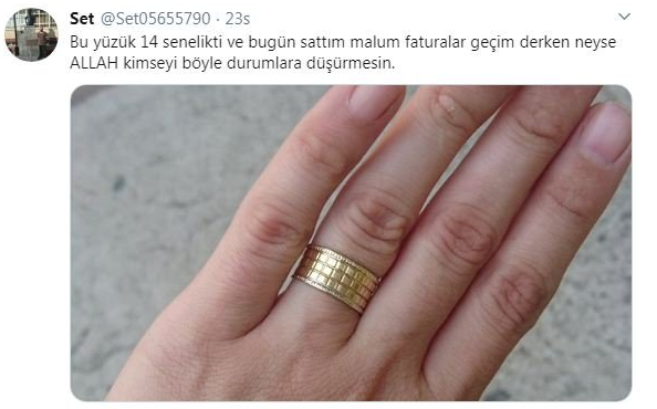 Twitter’da “Set” kullanıcı isimli bir vatandaş, 14 yıllık evlilik yüzüğünü faturalar ve geçim sıkıntısı nedeniyle sattığını açıkladı.