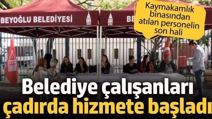 Kaymakamlık binasından çıkarılan Beyoğlu Belediyesi çalışanları bina önünde kaldırım üzerine çadır kurarak hizmet vermeye başladı.