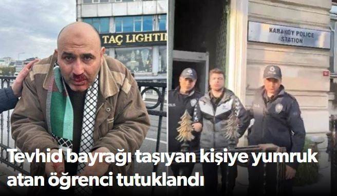 Yeni yılın ilk saatlerinde İstanbul'da düzenlenen "Şehitlere rahmet, Filistin'e destek, İsrail'e lanet" yürüyüşü sırasında yaşanan olayda, Kelimei Tevhid bayrağı açan İsmail Aydemir'e saldıran üniversite öğrencisi Ege A., tutuklandı.
