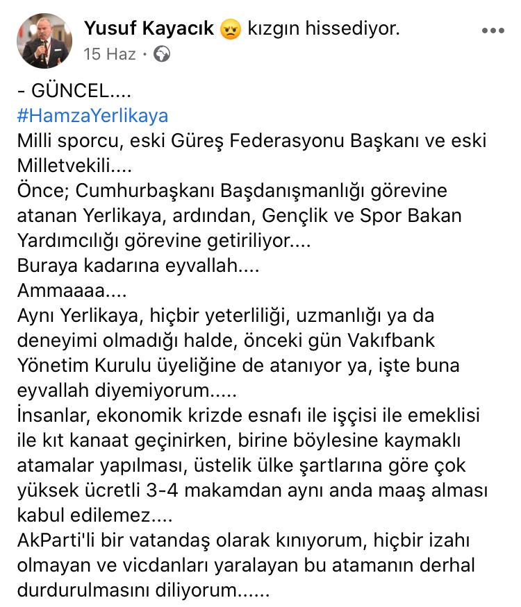 Kayacık paylaşımında, "Bir AK Partili olarak olarak atamanın hiçbir izahını yapamıyorum, insanlar kıt kanaat geçinirken, 34 ayrı makamdan maaş alınıyor, bunu kabul edemiyorum" gibi ifadelerde bulunmuştu.