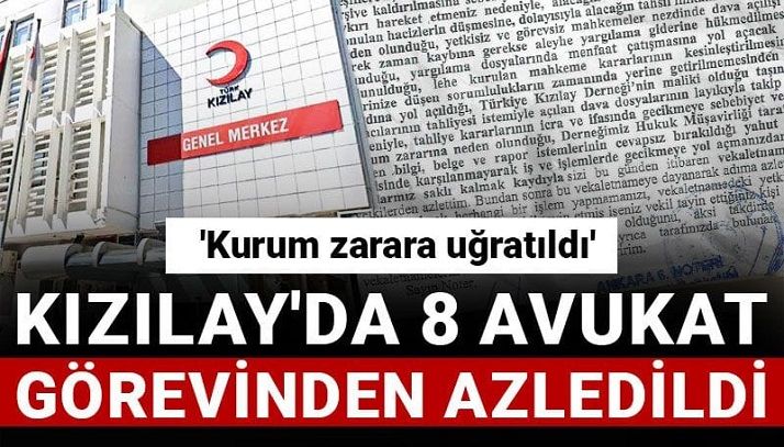 Türk Kızılay Genel Başkanı Fatma Meriç Yılmaz son olarak 8 avukatı birden görevden aldı. Azil yazısında hukuk müşavirliği incelemesi sonucunda ihmaller bulunduğu belirtildi. Yazıda bazı dava dosyalarında istinaf sürelerinin kaçırıldığı, duruşmalara katılınmadığı, teminat mektuplarının bozdurulmasına sebebiyet verildiği ve hacizlerin düşmesine neden olduğu belirtildi.