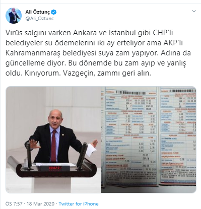 Ali Öztunç, "Virüs salgını varken Ankara ve İstanbul gibi CHP'li belediyeler su ödemelerini iki ay erteliyor ama AKP'li Kahramanmaraş belediyesi suya zam yapıyor. Adına da güncelleme diyor. Bu dönemde bu zam ayıp ve yanlış oldu. Kınıyorum. Vazgeçin, zammı geri alın." ifadelerini kullandı.