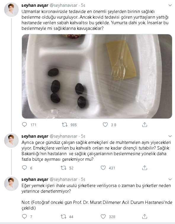 Sağlık çalışanlarının da aynı şekilde beslendiğini söyleyen Avşar "Ayrıca gece gündüz çalışan sağlık emekçileri de muhtemelen aynı yiyecekleri yiyor. Emekçilere verilen bu kahvaltı onları ne kadar dirençli tutabilir? Sağlık Bakanlığı’nın hastaların ve sağlık çalışanlarının beslenmesine yönelik daha fazla bütçe ayırması gerekmiyor mu? Eğer yemek işleri ihale usulü şirketlere veriliyorsa o zaman bu şirketler neden yeterince denetlenmiyor?" diye sordu.