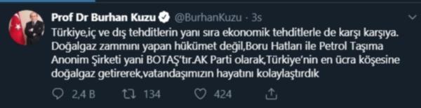 "Türkiye,iç ve dış tehditlerin yanı sıra ekonomik tehditlerle de karşı karşıya. Doğalgaz zammını yapan hükümet değil,Boru Hatları ile Petrol Taşıma Anonim Şirketi yani BOTAŞ’tır.AK Parti olarak,Türkiye’nin en ücra köşesine doğalgaz getirerek,vatandaşımızın hayatını kolaylaştırdık"