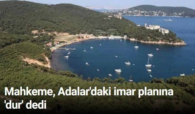 "Büyükkent Mimarlar Odası ile Adalılar, plana ‘Çevreye, ekosisteme zarar vereceği, deprem riskinin dikkate alınmadığı, kamunun değil özel kişilerin çıkarını korumaya öncelik verildiği ve iklim krizi’ gerekçeleriyle itiraz ederek toplu dava açtı. İstanbul 8’nci İdare Mahkemesi, başvuruyu haklı bularak yürütmenin durdurulmasına karar verdi. İmar planlarının Adalar’da geri dönüşü olmayan zararlar yaratabileceğine işaret eden mahkeme ‘Konut alanları kuralına aykırılık var. Konaklama tesisi yapılamaz. Yer seçimleri ve fonksiyon büyüklükleri de mevzuat dışı’ dedi.
