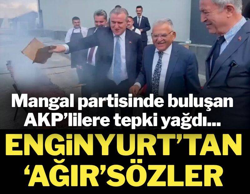 Enginyurt, AKP’nin mangal partisinde yer alan Akar ve Bak’ı sert sözlerle eleştirerek, “Allah'tan korkmaktan, kuldan utanmaktan bahseden Hulusi Akar, yanına bir de bakan almış, gençlikten sorumlu Osman Bak, oturmuşlar sucuk mangal yapıyorlar. Gençler sucuğu tanımaz hale geldi, emeklinin aylardır evine et girmiyor. Hulusi Akar mangal partisi yapıyor. Bir de bunu yayınlıyorlar. Nasıl utanmaz insanlarsınız siz yahu?” dedi.