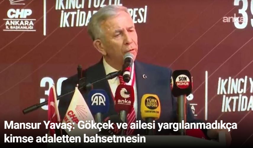 Ankara Büyükşehir Belediye Başkanı Mansur Yavaş CHP 39. Ankara Olağan İl Kongresi'nde konuştu. CHP'li belediyelere yapılan operasyonlara tepki gösteren Yavaş, AKP'li MElih Gökçek ve ailesini hatırlatarak "Gökçek ve ailesi yakalanıp ifadeleri alınıp hapse atılıp mahkum edilmedikçe Türkiye’de kimse adaletten bahsetmesin. Ama onların da yargılanacağı günler gelecek." dedi.