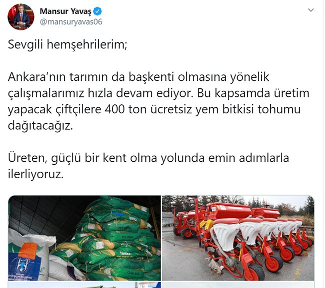 Yavaş mesajında şu ifadelere yer verdi: “Sevgili hemşehrilerim; Ankara'nın tarımın da başkenti olmasına yönelik çalışmalarımız hızla devam ediyor. Bu kapsamda üretim yapacak çiftçilere 400 ton ücretsiz yem bitkisi tohumu dağıtacağız. Üreten, güçlü bir kent olma yolunda emin adımlarla ilerliyoruz.”