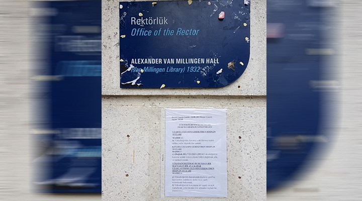 Boğaziçi Üniversitesi’nin Kayyum Rektörü Melih Bulu, atamaya karşı çıkan öğrencilere gözdağı verdi. “Rektörlük” tabelası üzerine yeniden yapıştırılan “Kayyumluk” yazıları bir kez daha söküldü. Güvenlik görevlileri bu kez tabelanın yanına disiplin yönetmeliğinden maddelerin yer aldığı bir kâğıt yapıştırdı.