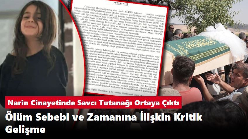 "Cumhuriyet Başsavcılığımızca ölen Narin GÜRAN hakkında yürütülen soruşturma kapsamında 08/09/2024 günü ölenin otopsi işlemleri yapılması için Diyarbakır Adli Tıp Kurumuna sevki talimatı verildiği, cenazenin Diyarbakır Adli Tıp Kurumu Başkanlığına 10:50'de getirildiği, 10:50'den itibaren Adli Tıp Grup Başkanı Eren AKGÜNDÜZ, Morg Ihtisas Dairesi Başkanı Servet KUZU, Adli Tip Şube Müdürü Sedat GÜLDOGAN, Adli Tip Uzmanı Emine SEVINDIR, Adli Tip Uzmanı Halit ERÖZ, Adli Tip Uzmanı Ramazan BUĞDAYCI, Adli Tip Uzmanı Kerim AYTAR, Patoloji Uzmanı Zübeyir TURAN ve ayrıca Gazi Yaşargil Eğitim ve Araştırma Hastanesinde görev yapan ve dosya için görevlendirilen Esra ERCIN, 3 adet otopsi teknikeri ve Cumhuriyet Savcılarımız Ahmet KUŞAK. Batuhan KARTAL ve Berat SAGIR ile beraber otopsi işlemlerine başlanıldığı.