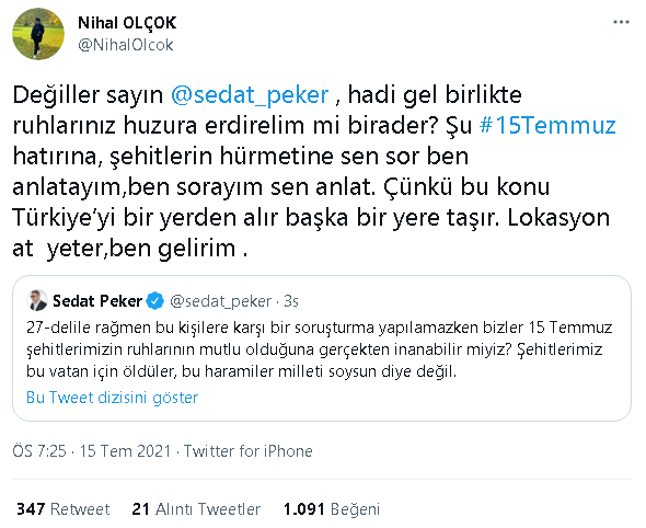 “Değiller sayın @sedat_peker, hadi gel birlikte ruhlarınız huzura erdirelim mi birader? Şu #15Temmuz hatırına, şehitlerin hürmetine sen sor ben anlatayım,ben sorayım sen anlat. Çünkü bu konu Türkiye’yi bir yerden alır başka bir yere taşır. Lokasyon at yeter, ben gelirim.”