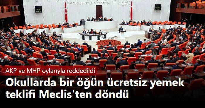 Plan ve Bütçe Komisyonu'nda Milli Eğitim Bakanlığı bütçesi görüşülürken muhalaefet partilerinin okullarda 1 öğün ücretsiz yemek verilmesi için sunduğu ek bütçe teklifi AKP ve MHP'nin oylarıyla reddedildi.