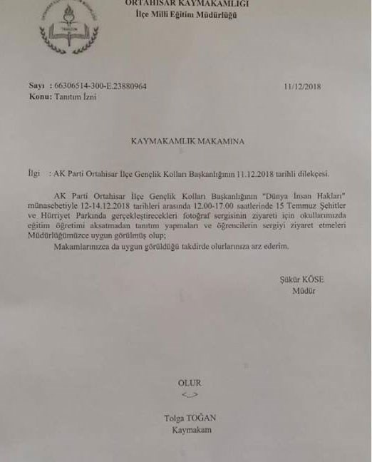 AKP Gençlik Kolları, “Dünya İnsan Hakları Günü” dolayısıyla 81 ilde fotoğraf sergisi açtı. Etkinlik kapsamında Trabzon Merkez’de yapılan organizasyon için okullara talimat yazısı gönderildi. Ders saatlerine denk gelen sergiye ilişkin Ortahisar İlçe Milli Eğitim Müdürü Şükür Köse imzasıyla okullara gönderilen yazıda, “Öğrencilerin ziyaret etmeleri müdürlüğümüzce uygun görülmüştür” ifadelerine yer verildi. Kaymakamlık oluruyla okul yönetimlerine ulaştırılan yazıda, AKP Gençlik kolları üyelerinin okullarda, “Eğitim ve öğretimi aksatmadan” etkinliğin tanıtımını yapabileceği belirtildi.