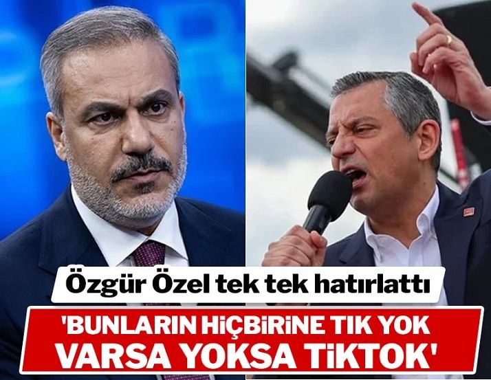 CHP Genel Başkanı Özgür Özel, sosyal medya hesabından yaptığı açıklamayla Dışişleri Bakanı Hakan Fidan’a tepki gösterdi. Özel, başta İsrail olmak üzere Fidan’ın birçok konudaki açıklamalarındaki tutarsızlıklara dikkat çekerek, 'Bunların hiçbirine tık yok, varsa yoksa TikTok' ifadelerini kullandı.